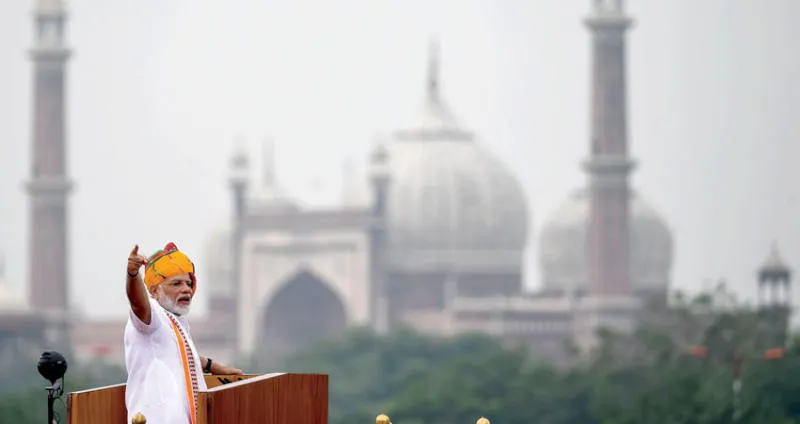 رئيس الوزراء الهندي ناريندرا مودي خلال إلقاء كلمته بمناسبة عيد استقلال بلاده أمس (أ.ف.ب)
