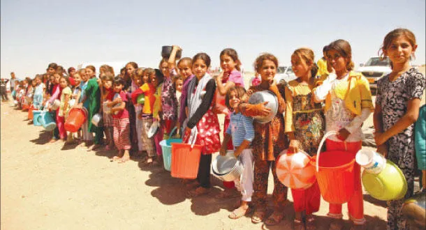فتيات إيزيديات نزحن مع ذويهن من سنجار ينتظرن الحصول على معونة غذائية في مخيم بضواحي مدينة دهوك (رويترز)