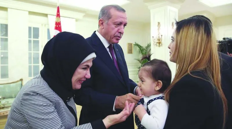 الرئيس التركي رجب طيب إردوغان وزوجته أمينة لدى استقبالهما أمس بعض الرهائن الأتراك السابقين في الموصل الذين أخلى «داعش» سبيلهم (أ.ف.ب)