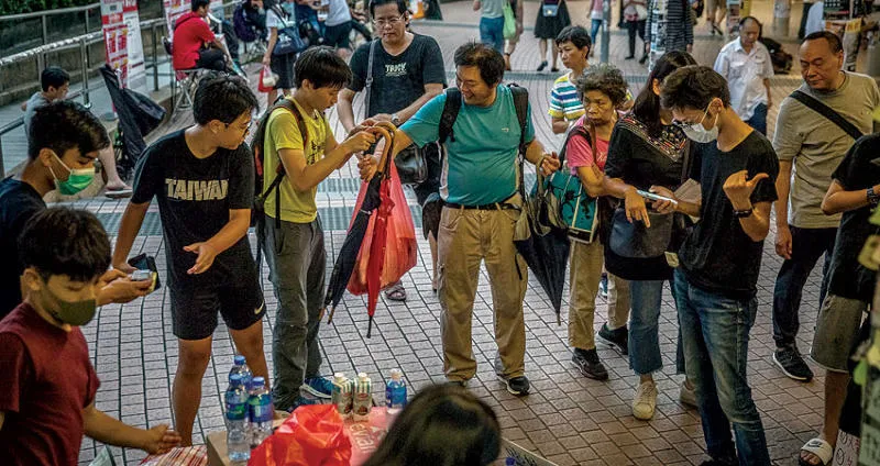 رجل يوزّع تبرعات على المتظاهرين في هونغ كونغ أمس (إ.ب.أ)