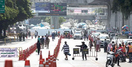 رجل أمن ينظم سير الراجلين قرب مخيم أقامه المتظاهرون المناهضون للحكومة في بانكوك أمس (أ.ب)