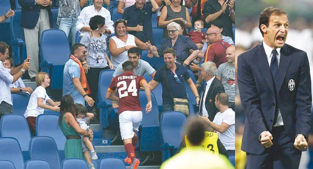 أليغري مدرب يوفنتوس يحتفل بالفوز على فريقه السابق (رويترز) - أليساندرو فيورنزي نجم روما (رقم 24) يصعد المدرجات للاحتفال مع جدته بهدفه (أ.ف.ب)