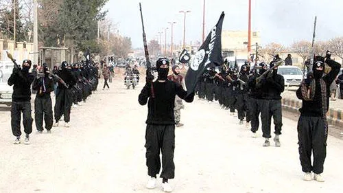 مقاتلون من {داعش} خلال عرض عسكري في مدينة الرقة السورية (أ.ب)