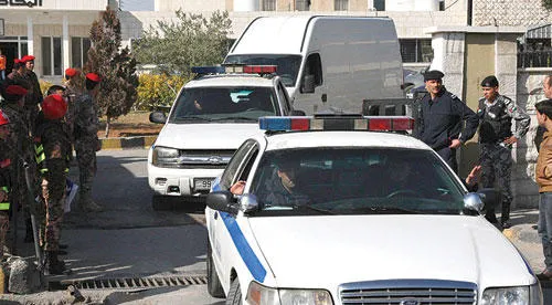عناصر الشرطة أمام أحد المقرات التي يحاكم فيها أبو قتادة في عمان أمس (رويترز)