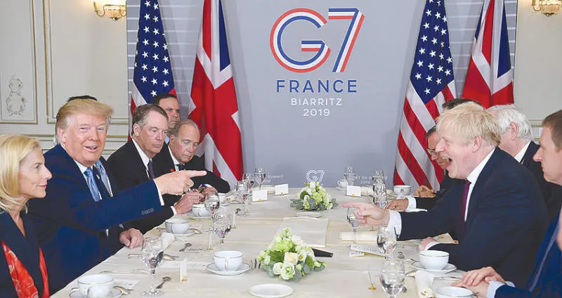 إلى ذلك، عقد الرئيس الأميركي قبل الظهر لقاء أول ودياً مع «صديقه» رئيس الوزراء البريطاني بوريس جونسون، ولوّح باتفاق تجاري «كبير جداً». وقال ترمب مبدياً تقاربه مع جونسون الذي يحضر قمة مجموعة السبع عازماً على الدفاع عن «بريكست»، إنه «الرجل المناسب للمهمة». ووعد بريطانيا بـ«اتفاق تجاري كبير جداً على وجه السرعة، أكبر من أي اتفاق سابق»، بعد خروج بريطانيا من الاتحاد الأوروبي في 31 أكتوبر (تشرين الأول).