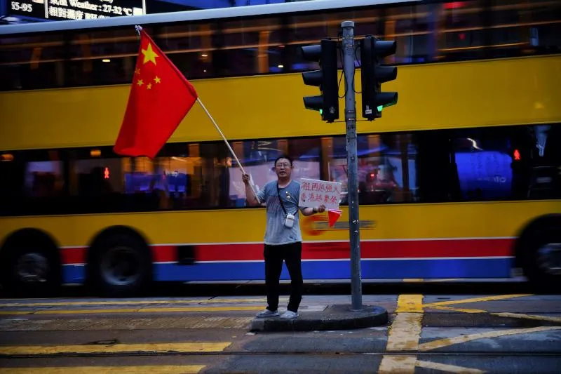 متظاهر وحيد مؤيد للحكومة في هونغ كونغ (أ.ف.ب)