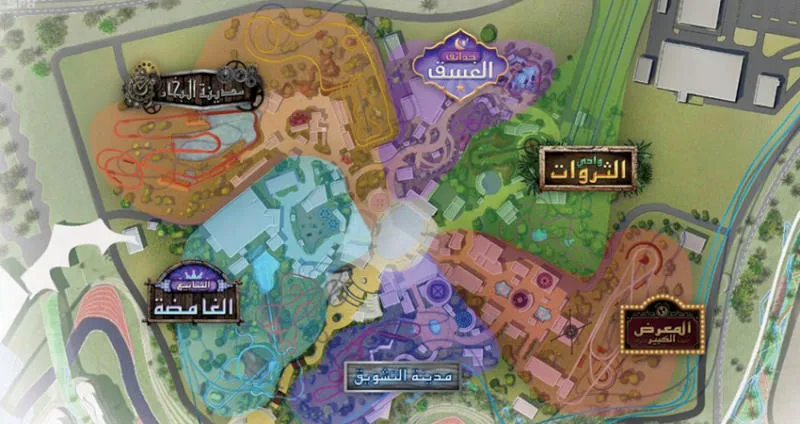 وشهد حفل الإعلان عن تصاميم وتفاصيل المشروع، أمس، الإعلان عن تفاصيل المتنزه الذي يمتد على مساحة تبلغ 32 هكتاراً، ويضم 28 لعبة ومعلماً جاذباً في 6 مناطق ترفيهية بالمشروع، هي: مدينة التشويق، والينابيع الغامضة، ومدينة البخار، وحدائق الغسق، ووادي الثروات، والمعرض الكبير.