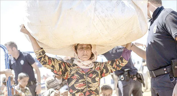 نازحة كردية سورية تحمل متاعها فوق رأسها وهي تعبر الحدود إلى تركيا أمس (أ.ف.ب)