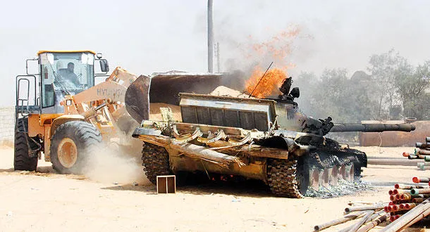دبابة محترقة بعد المواجهات التي شهدتها بلدة ورشفانة أمس (أ.ف.ب)