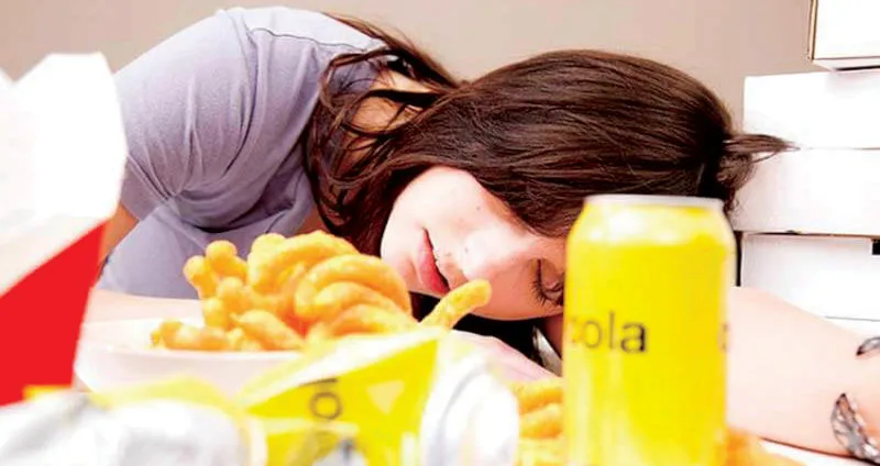 -الارتفاع السريع في نسبة السكر بالدم بُعيد تناول وجبة الطعام يُحفز تفاعلات ارتفاع كمية الأنسولين وسرعة إفرازه، المؤدي إلى الشعور بالنعاس والتعب. والحرص على تناول الأطعمة ذات المؤشر السكري Glycemic Index المنخفض، مثل الخبز الأسمر، بخلاف الأبيض المصنوع من الدقيق الخالي من قشرة حبوب القمح، والحرص على تناول الخضار والبقول في بداية الوجبة، هو كله مما يقلل ذلك أيضاً، مع خفض كمية الخضار النشوية كالبطاطا والمعجنات.