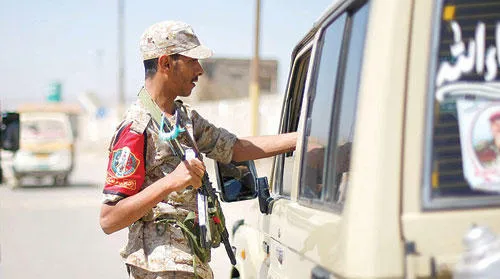 جندي يمني يفحص هوية سائق سيارة عند إحدى نقاط التفتيش بأحد شوارع صنعاء أمس (أ.ب)