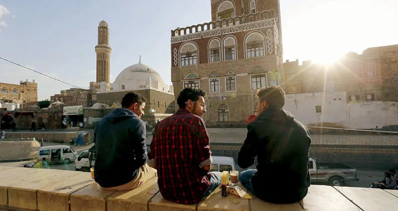 شبان يتحدثون ويظهر من أمامهم أحد مباني المدينة القديمة في صنعاء (إ.ب.أ)