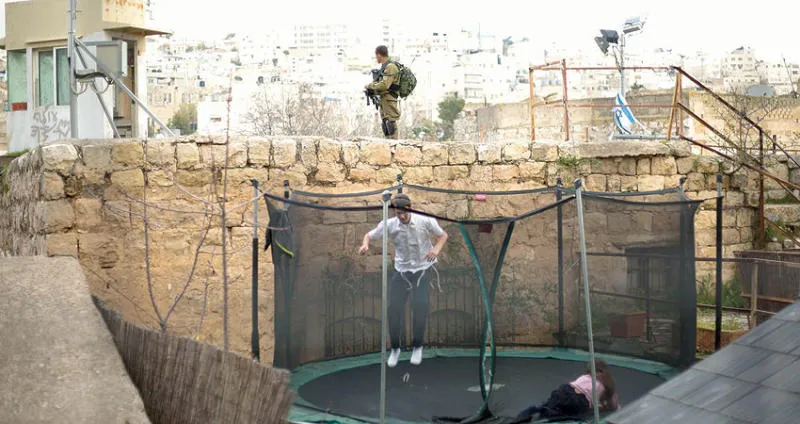 جندي اسرائيلي يحرس مستوطنين يلهون على الترمبولين في الخليل بالضفة الغربية (أ.ب)