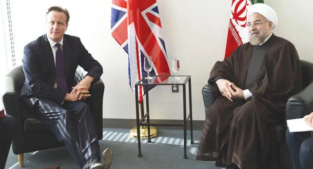 اجتمع الرئيس الإيراني حسن روحاني، ووزير خارجيته جواد ظريف، مع رئيس الوزراء البريطاني ديفيد كاميرون، صباح أمس، بمقر البعثة البريطانية بالأمم المتحدة، في أول لقاء على هذا المستوى بين البلدين منذ ثورة 1979 الإيرانية. وبعد أن كانت المكالمة الهاتفية بين روحاني والرئيس الأميركي باراك أوباما، العام الماضي، تاريخية في أول مكالمة هاتفية بين رئيسي البلدين منذ أكثر من 3 عقود، كسر لقاء أمس حاجزا جديدا أمام عزلة إيران الدبلوماسية.
