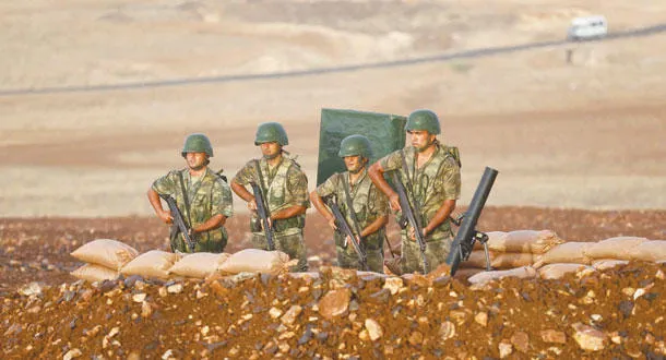 جنود أتراك على أهبة الاستعداد قرب الحدود السورية أمس (رويترز)