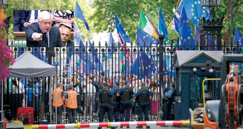 متظاهرون مناهضون لخروج بريطانيا من الاتحاد الأوروبي تظاهروا أمام بوابات مقر الحكومة في لندن أمس وفي الإطار جونسون يتحدث خلال جلسة صاخبة في مجلس العموم فقد خلالها الأغلبية البرلمانية أمس (أ.ف.ب)