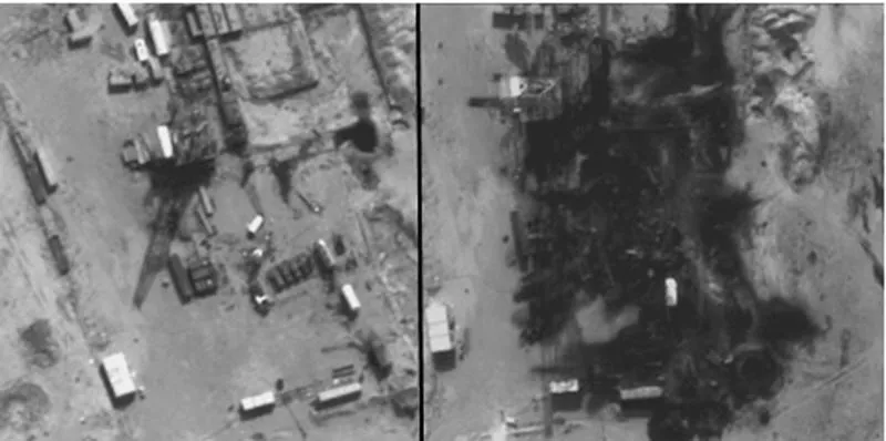 مصافي نفط في سوريا قبل تعرضها للقصف من قبل التحالف العربي الأميركي (يمين) وبعد تدميرها أمس (رويترز)