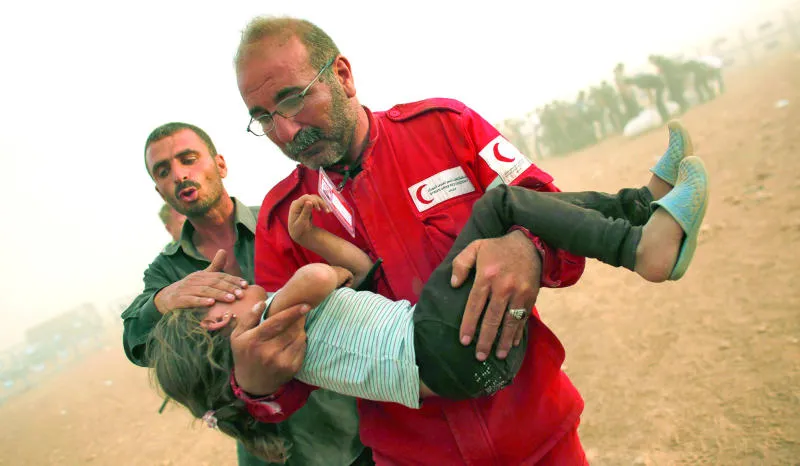 عضو من الهلال الأحمر السوري يحمل طفلة لاجئة لإعطائها الإسعافات الأولية داخل خيمة بعد عبور الحدود مع تركيا في منطقة سانليورفا أمس.. وكان نحو 140 ألفا من أكراد سوريا قد فروا باتجاه تركيا خلال الأسبوع الحالي (رويترز)