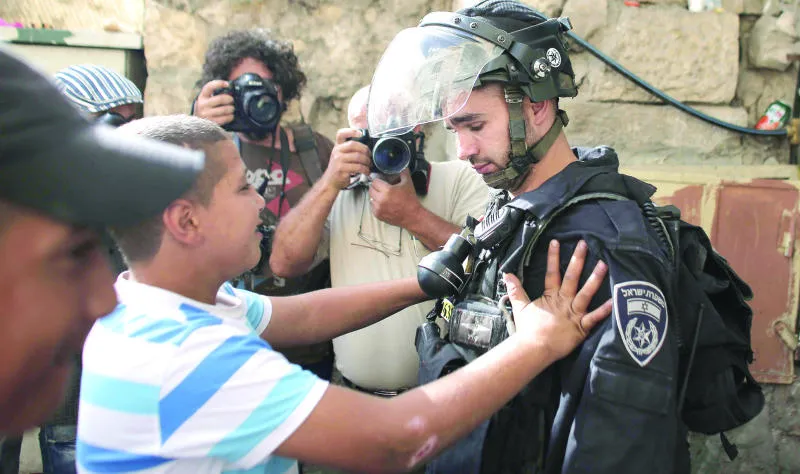فلسطيني في مواجهة مع جندي إسرائيلي بعد قرار السلطات الإسرائيلية إغلاق الضفة والقدس (أ.ف.ب)