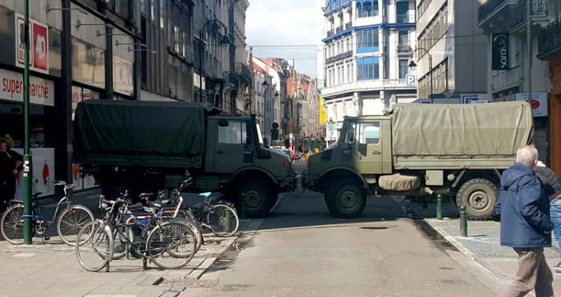 سيارات الجيش تغلق أحد الشوارع الرئيسية في أعقاب تفجيرات بروكسل 2016 (الشرق الأوسط)