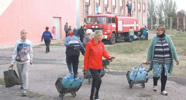 سكان يحملون أمس قوارير بلاستيكية ملأوها بالماء من ناقلة تابعة لجهاز الإطفاء في منطقة دونيتسك شرق أوكرانيا حيث يعانون أزمة ماء منذ 3 أشهر (إ.ب.أ)