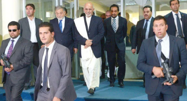 غني (وسط) أثناء وصوله رفقة حراسه الشخصيين إلى اجتماع عقدته اللجنة المستقلة للانتخابات وكشفت فيه النتائج الرسمية للاقتراع الرئاسي في كابل أمس (ا.ف.ب)