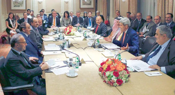 الأمير سعود الفيصل وإلى جواره وزير الخارجية الأميركي خلال اجتماع وزراء مجلس التعاون مع كيري في نيويورك مساء أول أمس (رويترز)