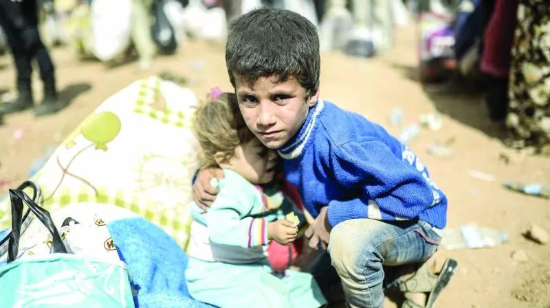 طفل سوري يحتضن شقيقته بعد فرارهما من كوباني ووصولهما الى الحدود التركية أمس (أ.ف.ب)