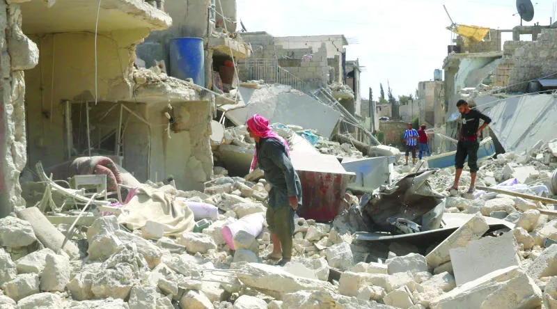 سوريون يعاينون الدمار الذي خلفه برميل متفجر ألقته القوات الحكومية على مدينة حلب أمس (أ.ف.ب)
