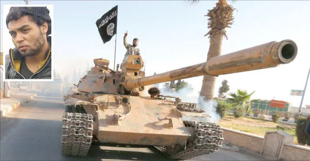 جيجوين ديمتري.. محاكمته تنطلق غدا في مدينة أنتويرب شمال بلجيكا («الشرق الأوسط»)، صورة أرشيفية لأحد عناصر {داعش} يستعرض قوة التنظيم فوق دبابة في محافظة الرقة في يوليو الماضي (رويترز)