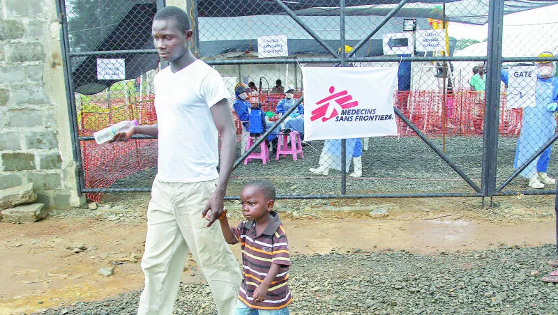 رجل يغادر مركزا صحيا أقامته منظمة «أطباء بلا حدود» قصده بعد ظهور أعراض مرض «إيبولا» لدى ابنه في مونروفيا (إ.ب.أ)