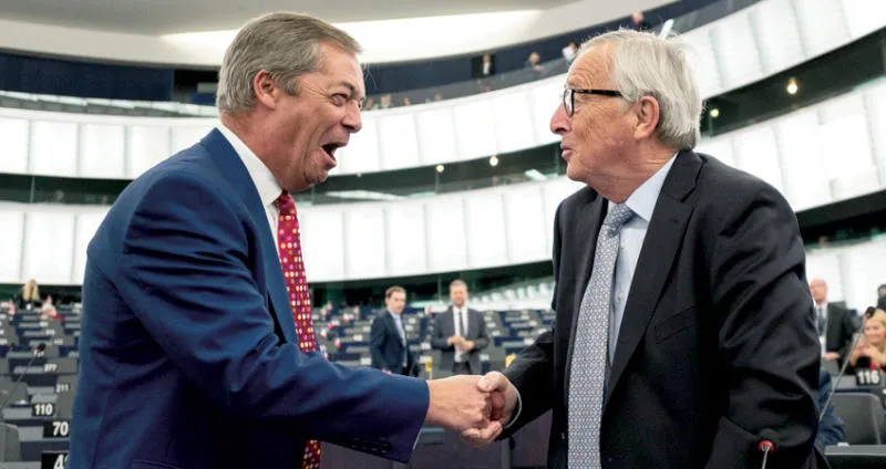 فاراج يصافح يونكر قبل انطلاق النقاش في البرلمان الأوروبي أمس (إ.ب.أ)
