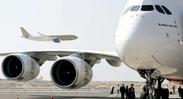 طائرة من طراز إيرباص إيه 330 تابعة لطيران الخليج في استعراض خلال معرض البحرين للطيران أمس (رويترز)