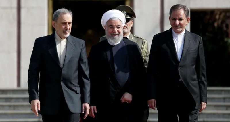 الرئيس الإيراني يتوسط نائبه الأول إسحاق جهانغيري وعلى أكبر ولايتي مستشار المرشد للشؤون الدولية قبل مغادرة طهران أمس (موقع الرئاسة)