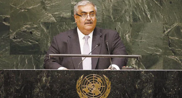 وزير خارجية البحرين الشيخ خالد بن أحمد آل خليفة خلال إلقائه كلمة بلاده أمام الجمعية العامة للأمم المتحدة في نيويورك أمس (رويترز)