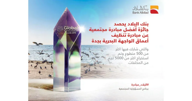 > حصل بنك البلاد على جائزة «أفضل مبادرة مجتمعية» (Best CSR initiative) المقدمة من «Global Business Outlook Awards» المتخصصة في قياس أداء المؤسسات والشركات المحلية والخارجية على مستوى العالم. يأتي حصول البنك على الجائزة نظير مبادرة تنظيف أعماق الواجهة البحرية بجدة «العمق علينا» التي شارك فيها أكثر من 500 متطوع وتم استخراج أكثر من 5000 كغم من المخلفات المهددة للحياة الفطرية.