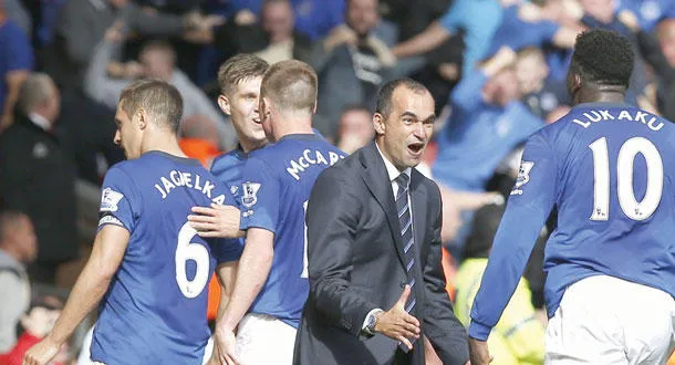 لاعبو إيفرتون ومدربهم مارتينيز المنتشون بالتعادل مع ليفربول يأملون التقدم خطوة جديدة في الدوري الأوروبي (رويترز)