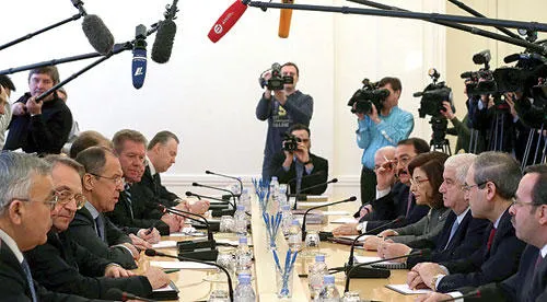 جانب من اللقاء الروسي - السوري في موسكو برئاسة وزيري خارجية البلدين لافروف والمعلم (إ.ب.أ)