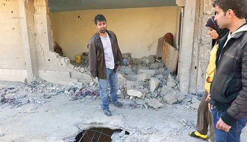 لبنانيون يعاينون آثار سقوط القذائف على بلدة عرسال الحدودية أمس (رويترز)