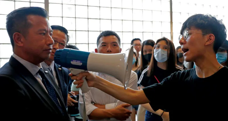 طالب في جامعة هونغ كونغ يواجه أحد المسؤولين بعد دخول الشرطة الحرم الجامعي أمس (رويترز)