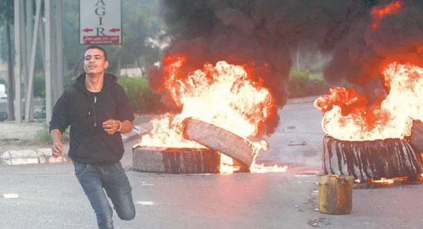 شاب فلسطيني يركض هربا من ملاحقة قوات الأمن الإسرائيلية بعد حدوث مواجهات بين فلسطينيين وقوات اسرائيلية في الضفة الغربية أمس (أ.ب)