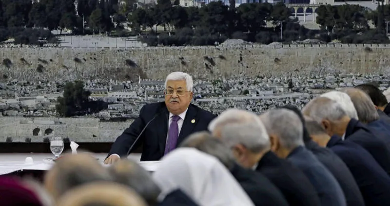 الرئيس محمود عباس يتحدث إلى قيادات فلسطينية في مقره برام الله الأحد الماضي (أ.ف.ب)