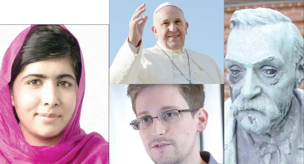 العالم والصناعي ألفريد نوبل (1833-1896) - البابا فرنسيس (أ.ف.ب) - الأميركي إدوارد سنودن (أ.ف.ب) - الباكستانية ملالا يوسفزاي
