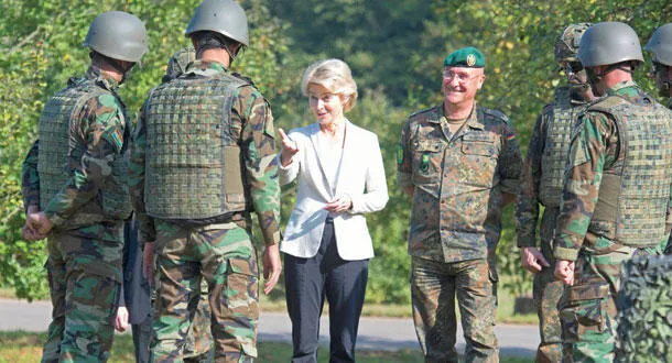 وزيرة الدفاع الألمانية ارسولا فون دير لاين تتفقد سير تدريب بعض ضباط وجنود البيشمركة من أكراد العراق في معسكر ألماني أول من أمس (أ.ب)