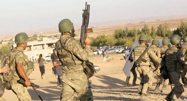 جنود أتراك يتصدون لمحتجين أكراد بالقرب من الحدود السورية أمس حيث تتعرض مدينة كوباني السورية لقصف من عناصر «داعش» (أ.ب)