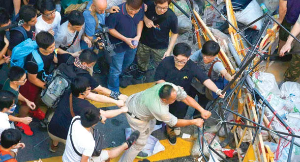 حشد من الناس يمنعون رجلا أراد إزالة حواجز أقامها المتظاهرون المطالبون بالديمقراطية في حي مونغ كوك التجاري بهونغ كونغ أمس (رويترز)