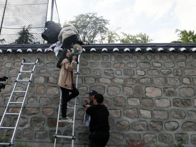 طلاب كوريون جنوبيون يتسلقون جداراً محيطاً بمنزل السفير هاري هاريس باستخدام سلالم (إ.ب.أ)