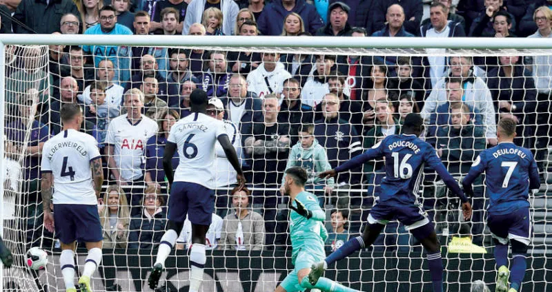 عبد الله دوكوري (رقم 16) لاعب واتفورد يسجل هدف فريقه الصادم في مرمى توتنهام (أ.ف.ب)