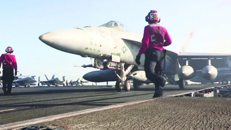 طائرة «إف 18» في طريقها للانطلاق من حاملة الطائرات الأميركية «يو إس إس جورج بوش» لقصف أهداف داعش في العراق أمس (أ.ف.ب)