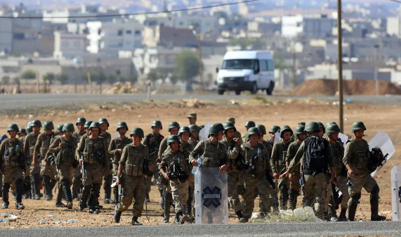 جنود أتراك يتوجهون للتموقع على الحدود التركية السورية قرب كوباني (أ.ب)